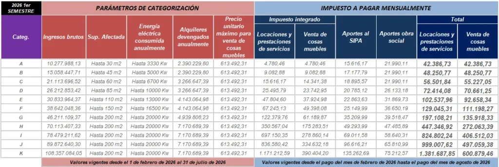 El incremento también se refleja en las obligaciones mensuales. Los montos totales estimados a ingresar, considerando impuesto integrado, aporte jubilatorio y obra social, ascenderían aproximadamente a $42.386 en la categoría A, $48.507 en la B, $56.501 en la C, $72.414 en la D, $102.548 en la E, $129.045 en la F, $174.378 en la G, $447.347 en la H, $606.019 en la I, $805.938 en la J y superarían los $1.080.000 mensuales en la categoría K, dependiendo de si se trata de servicios o venta de cosas muebles.