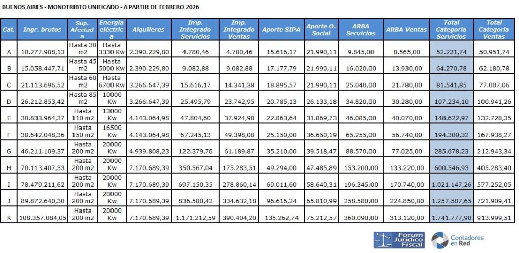 De esta manera la tabla de Monotributo unificado para provincia de Buenos Aires a partir de Febrero 2026 queda de la siguiente manera: