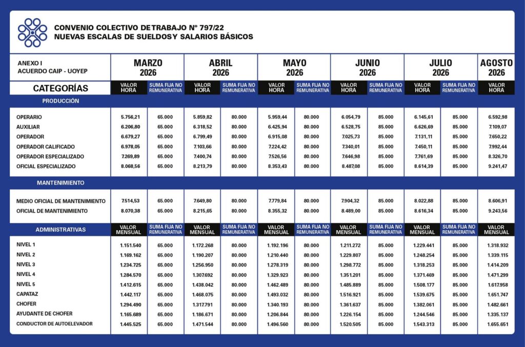 Se establecen nuevas escalas salariales desde marzo a agosto 2026 con actualización mensual de valores por hora (producción y mantenimiento) y valores mensuales (administrativos). El esquema incluye incrementos progresivos en todos los meses, con subas acumulativas que impactan tanto en categorías operativas como jerárquicas.