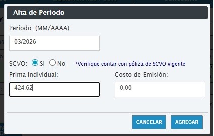 - Luego visualizará una interfaz que permitirá completar los campos con los datos correspondientes: periodo (mm/aaaa) y datos específicos relacionados con el SCVO (Seguro Colectivo de Vida Obligatorio).